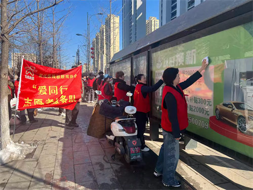 活动中,志愿者们热情高涨、干劲十足,手持抹布、水桶、清洁铲等工具,对公交站牌进行全面清理,擦拭灰尘、铲除小广告、清洁座椅立柱,不留死角。残疾人志愿者克服身体不便,认真擦拭低位站牌、清理周边环境,展现出自强自立的精神风貌。蓝鲨救援队做好重点区域清洁与安全保障,各队伍分工协作、残健互助,成为街头一道温暖风景线。